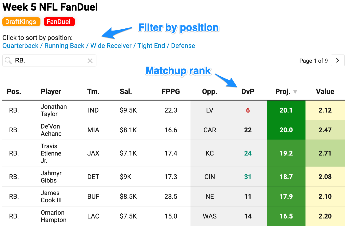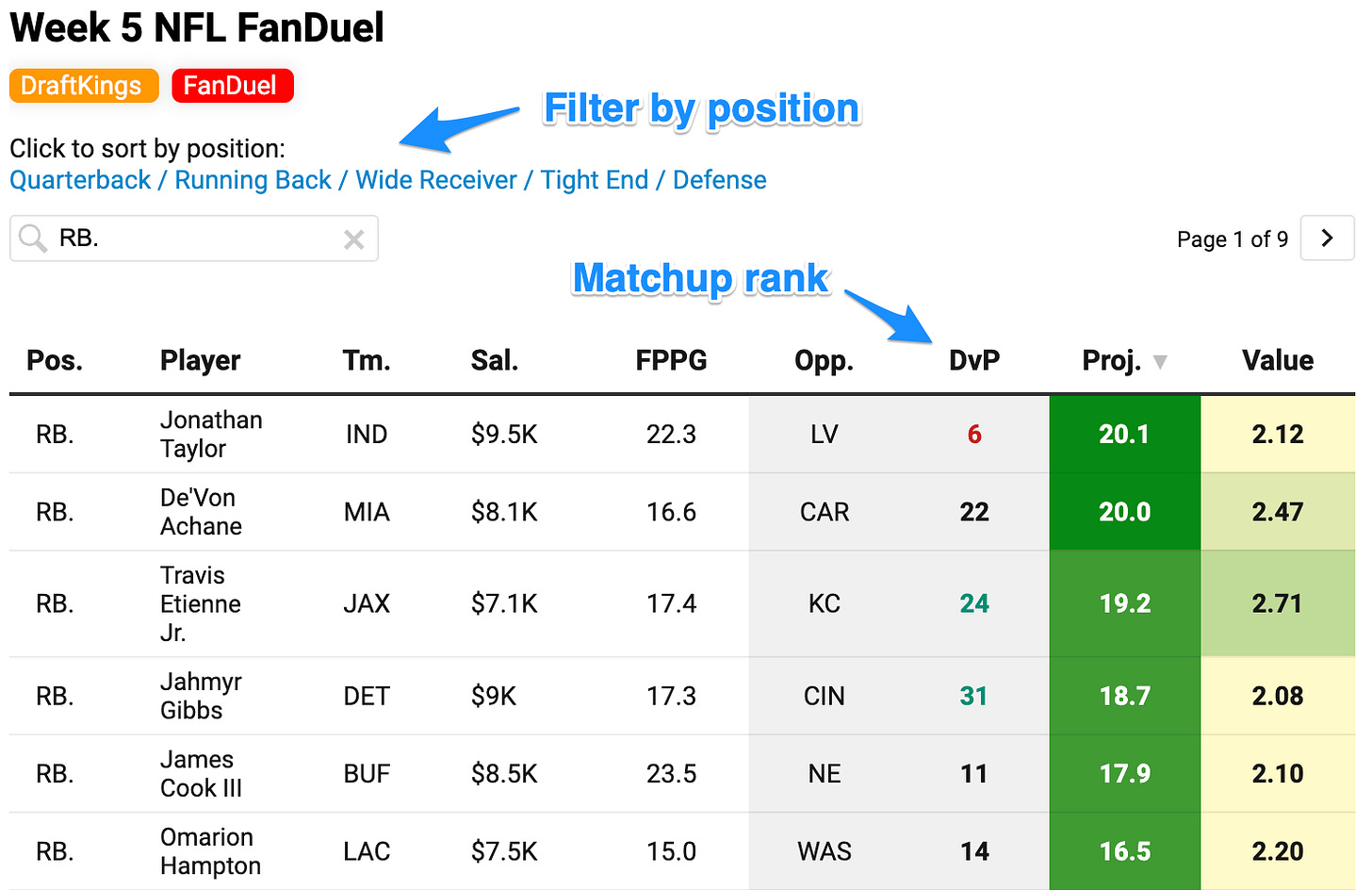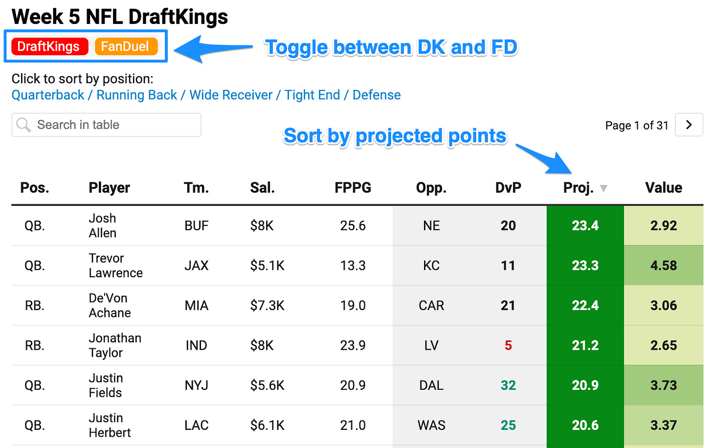You can toggle between DraftKings and FanDuel, filter by position, and sort the order based on projected points, value, salary, and more.
