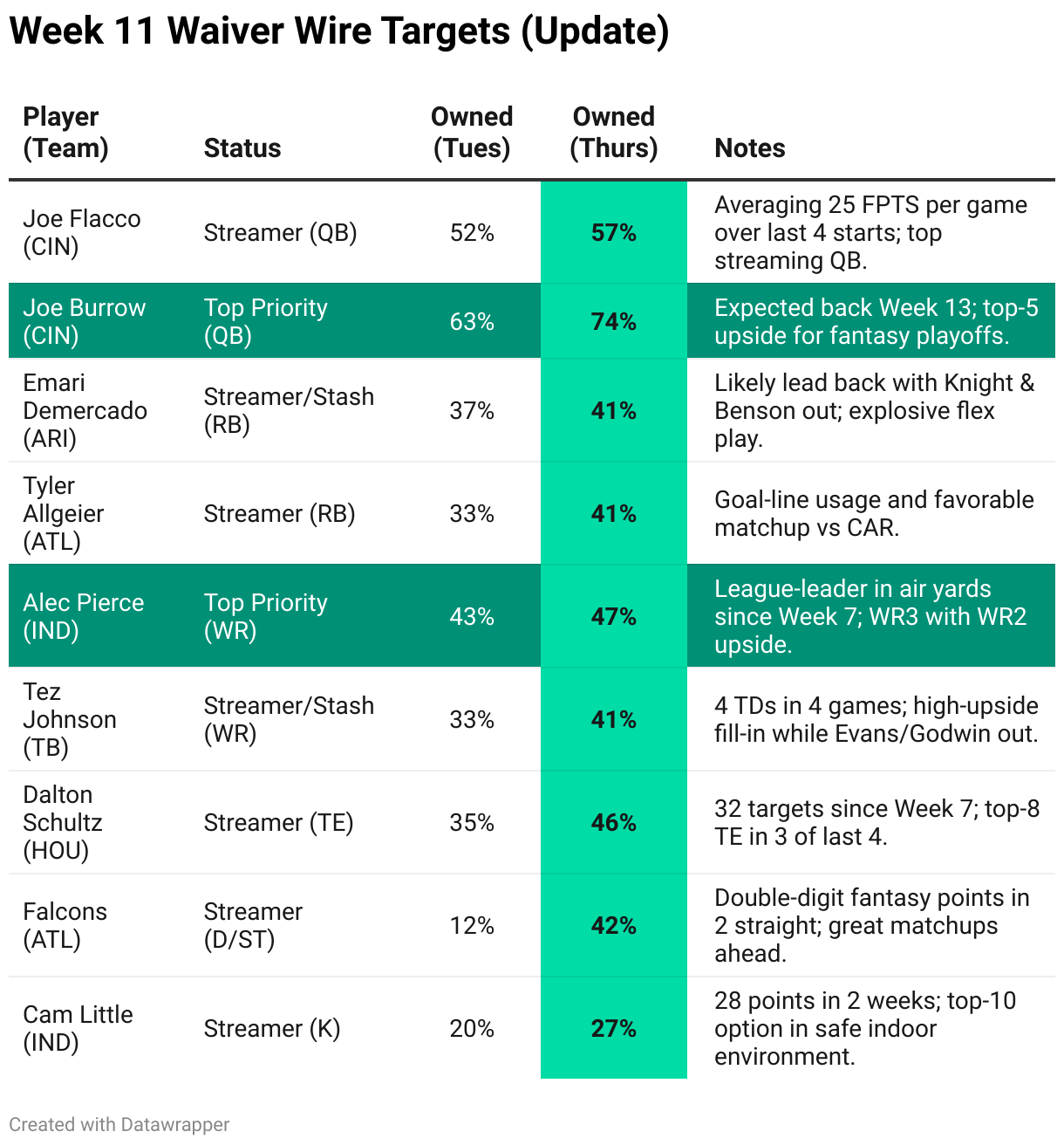 The key players I highlighted in Tuesday’s Week 11 Waiver Wire post. You can still check if these guys are available, but if you want this delivered to your inbox each Tuesday before your waiver deadline, make sure you’re subscribed.