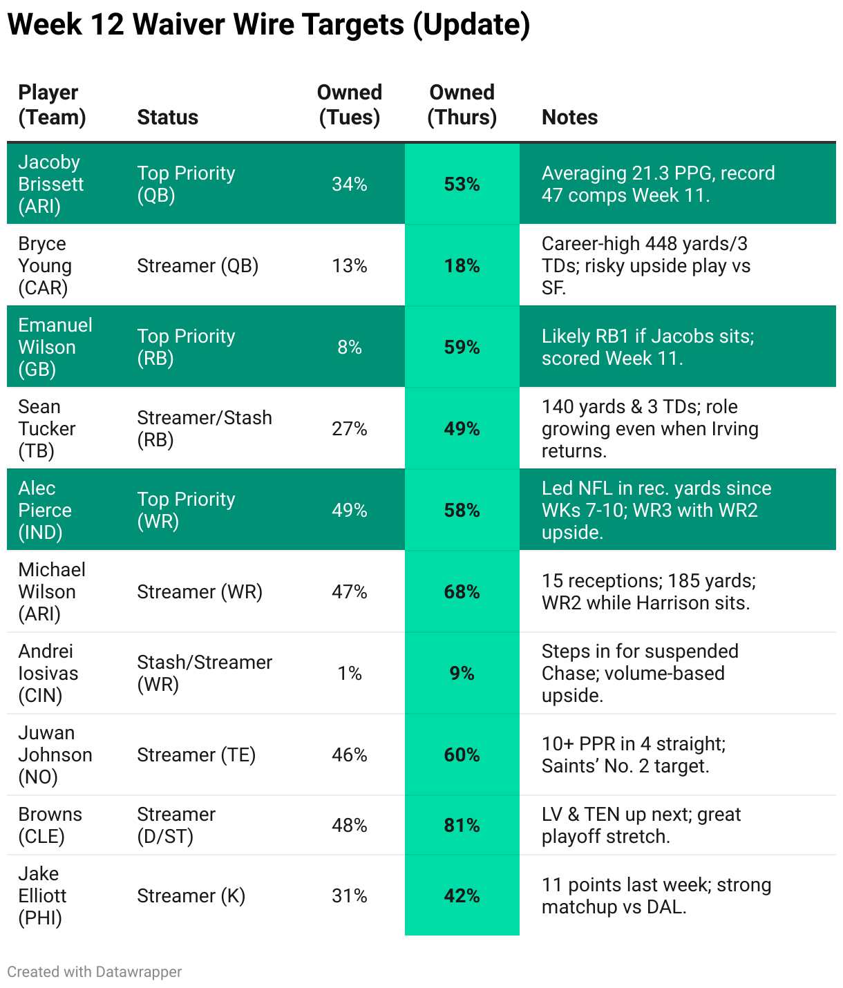 The key players I highlighted in Tuesday’s Week 12 Waiver Wire post. You can still check if these guys are available, but if you want this delivered to your inbox each Tuesday before your waiver deadline, make sure you’re subscribed.