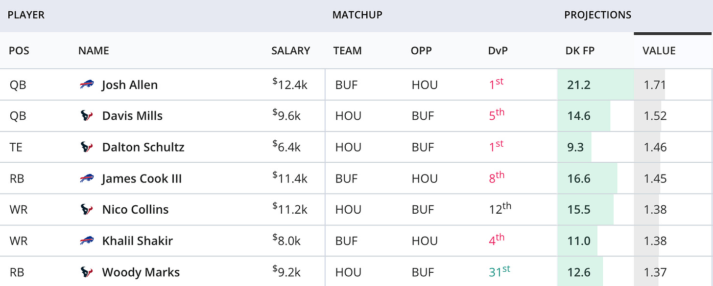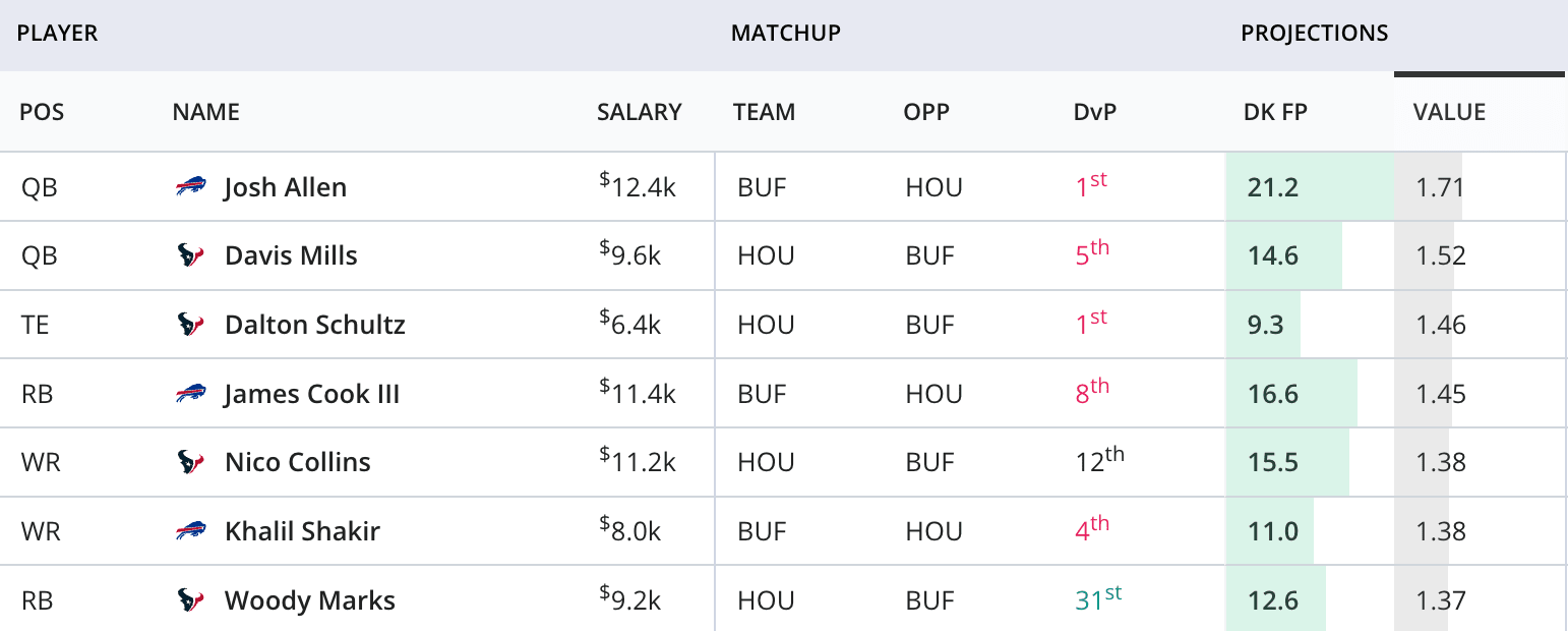 💸 DraftKings value ranks: BUF @ HOU on TNF