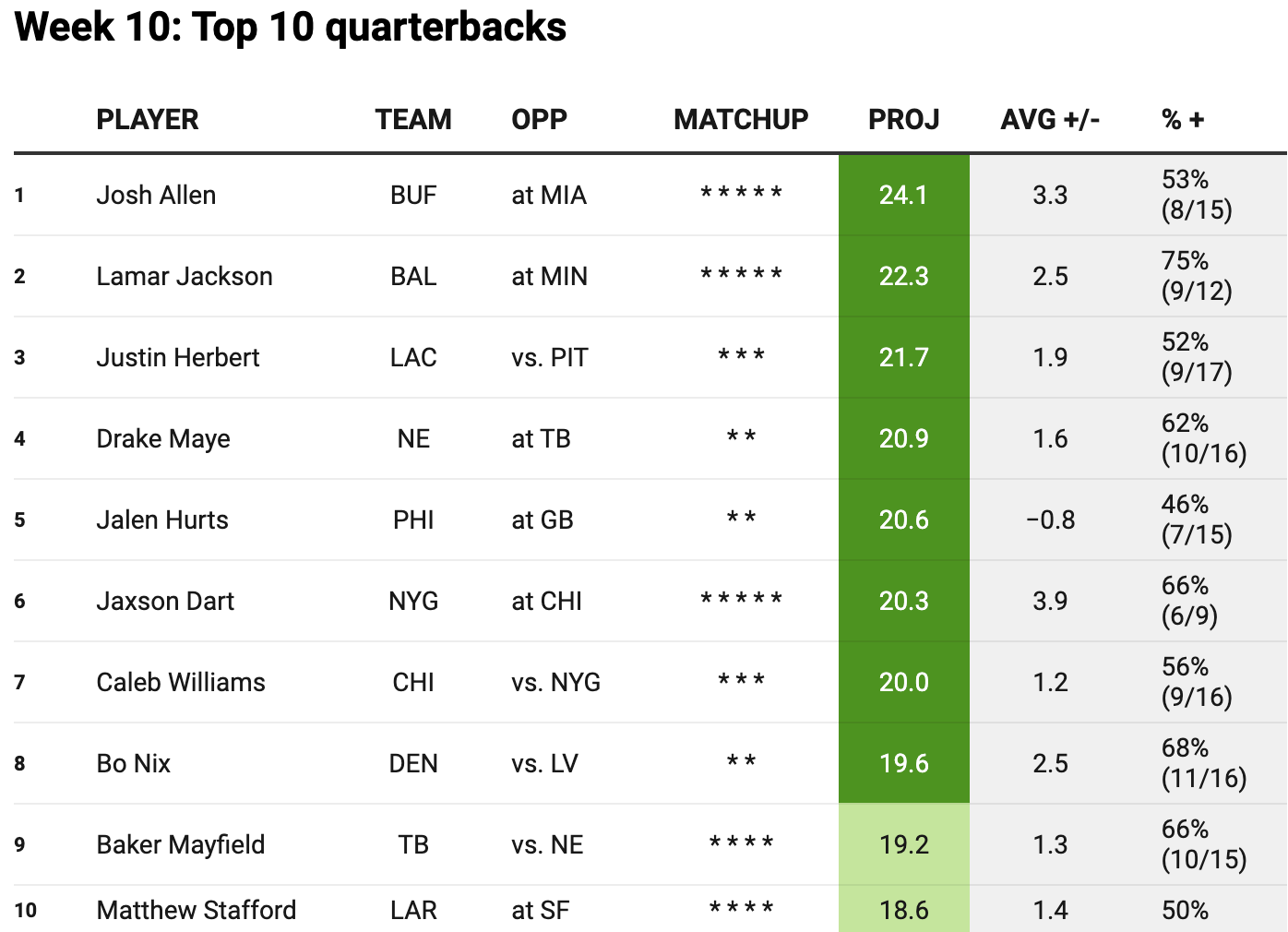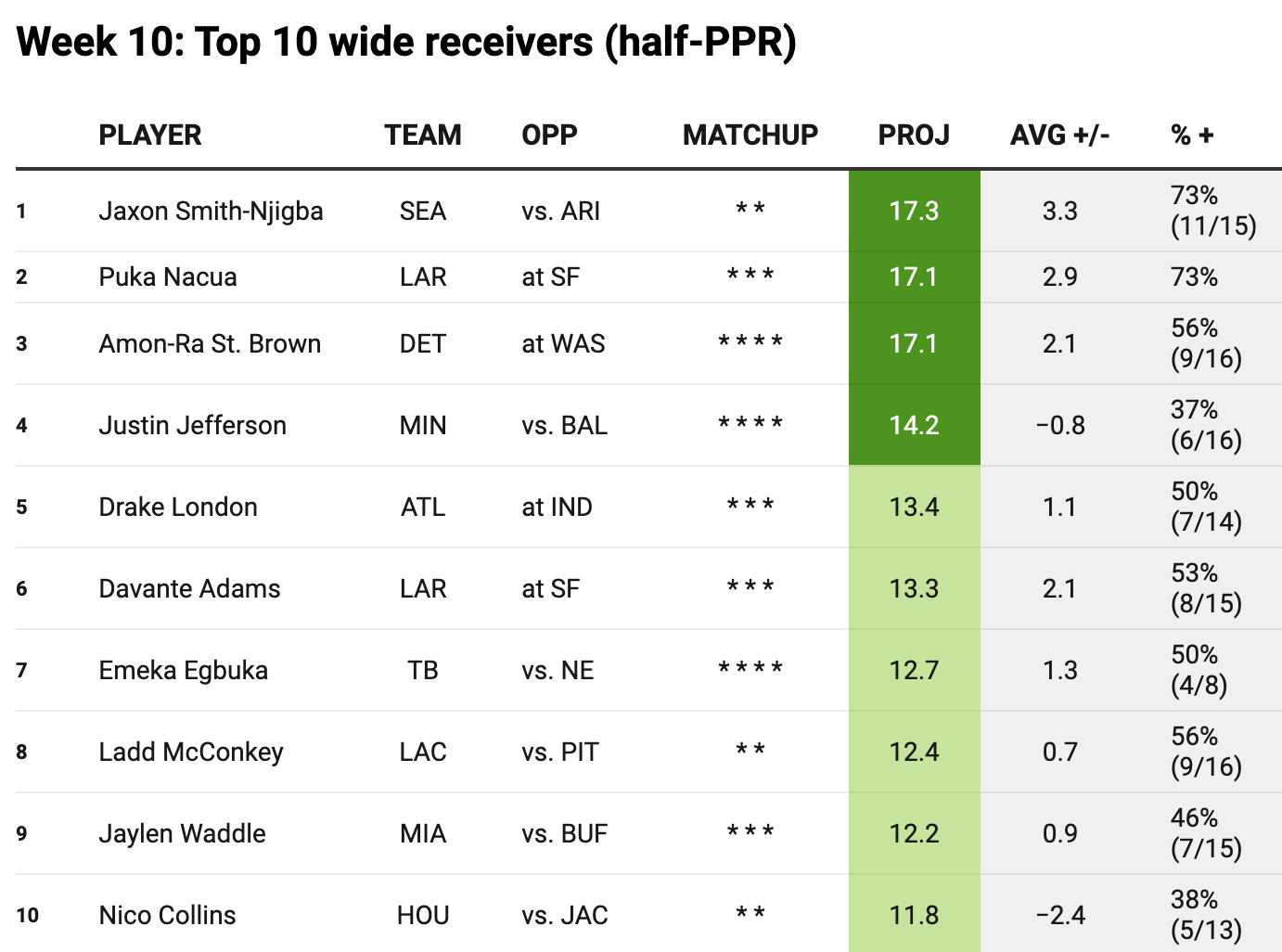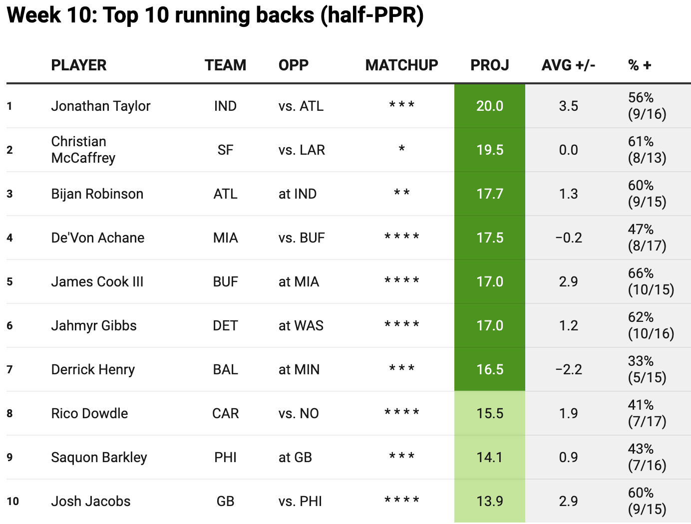 View the latest Week 10 player rankings for all positions and scoring formats.