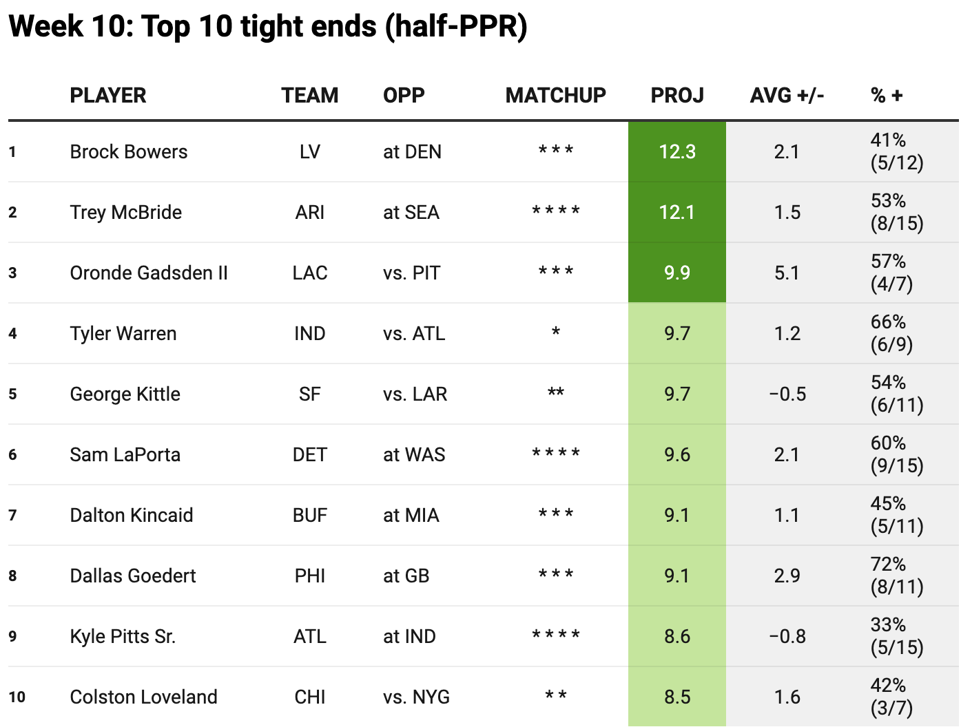 💪 Stud potential: Dalton Kincaid (BUF) at MIA — Kincaid is heating up at the right time for his fantasy owners, fresh off a 6/101/1 performance against Kansas City. He’s topped 14 PPR points in four of five games with at least four targets, and now faces Miami again— a defense allowing the fourth-most points to tight ends. With 66 yards and a TD against them in Week 3, Kincaid is an easy top-five TE pick in Week 10.
