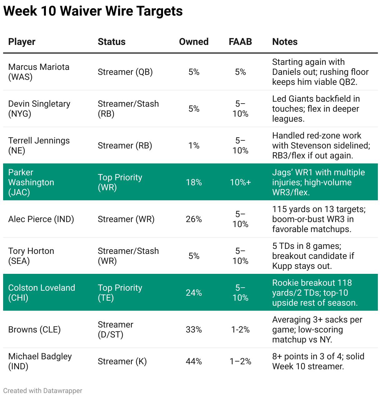 Below are the top players to target ahead of Week 10 — plus FAAB recommendations and matchup context for each position.