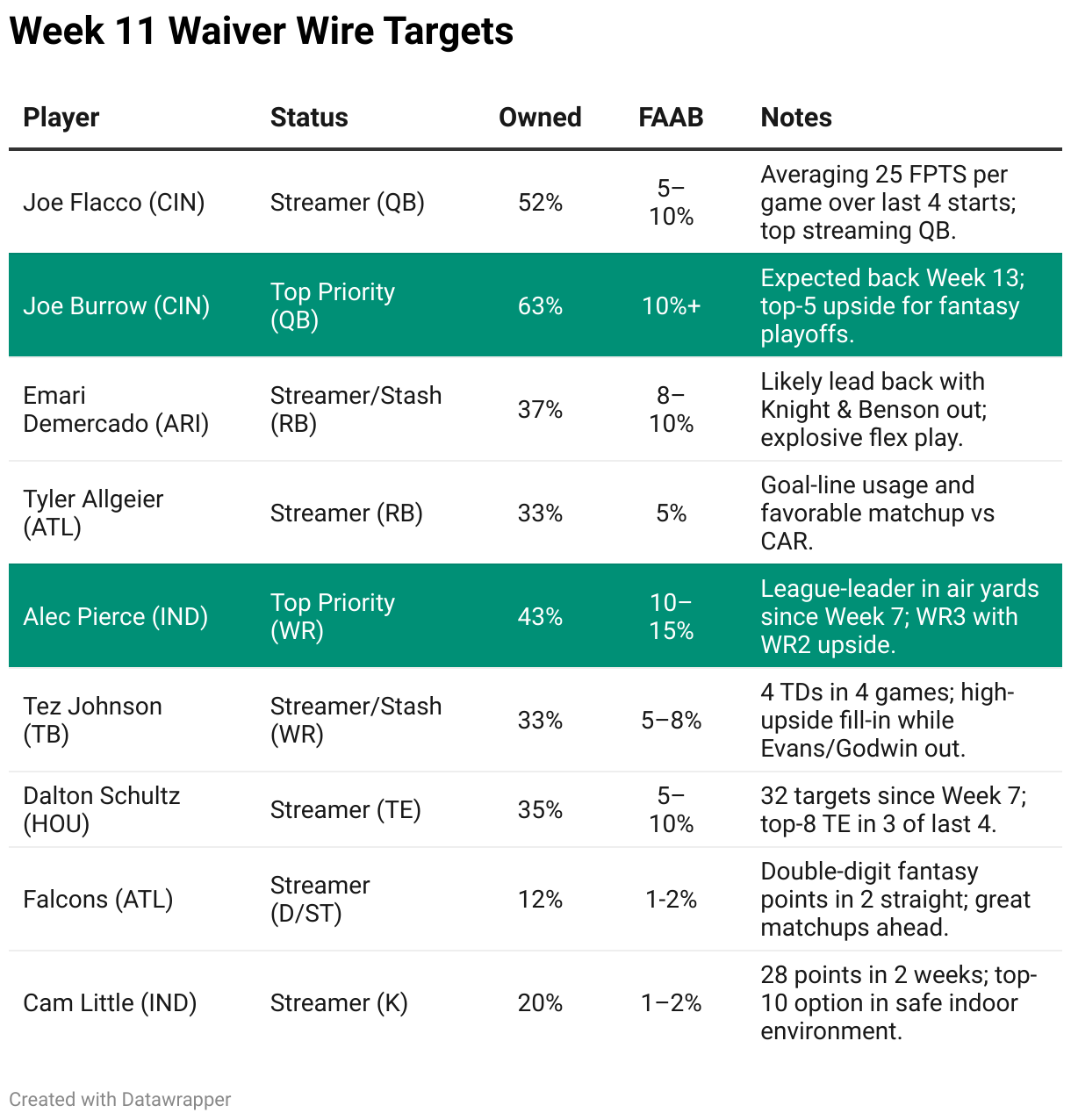 Below are the top players to target ahead of Week 11 — plus FAAB recommendations and matchup context for each position.