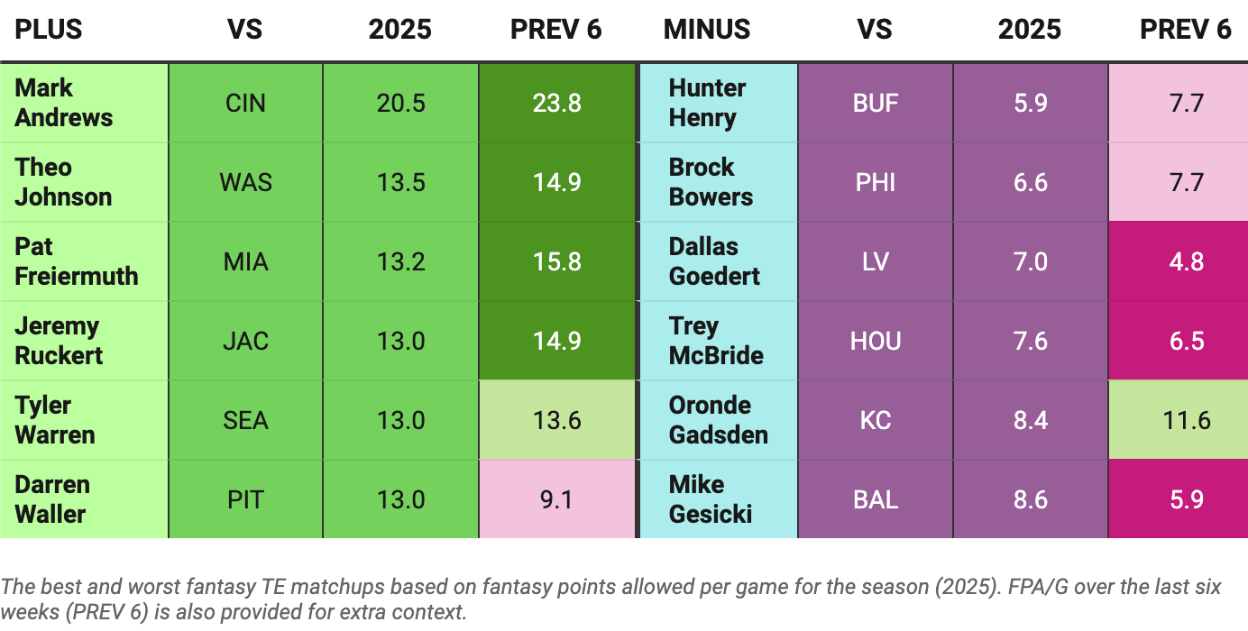 Oronde Gadsden still hasn’t scored a touchdown since Week 8 and has been held under 30 yards receiving in three of the last four games. … Hunter Henry gets the toughest TE matchup in the league against the Bills, against whom he only managed 6.6 FPs earlier this season.