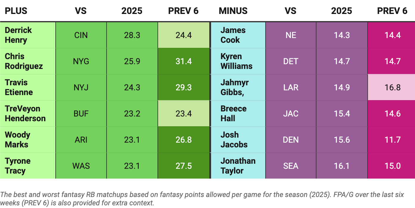 Coming off 26 carries in Week 14, Woody Marks is set up to eat a ton in a very favorable matchup and with an expected favorable game script, with the Texans 9.5-point favorites. When Houston leads, they tend to lean on the run, as Marks’ FP/snap climbs 64% in these situations. … From Week 9 onward, Travis Etienne has the 7th most fantasy points, and has six TDs over his past five games. Only the Giants have allowed more fantasy points per game since Week 9 than the Jets, who have yielded the most rushing TDs during that span (9).