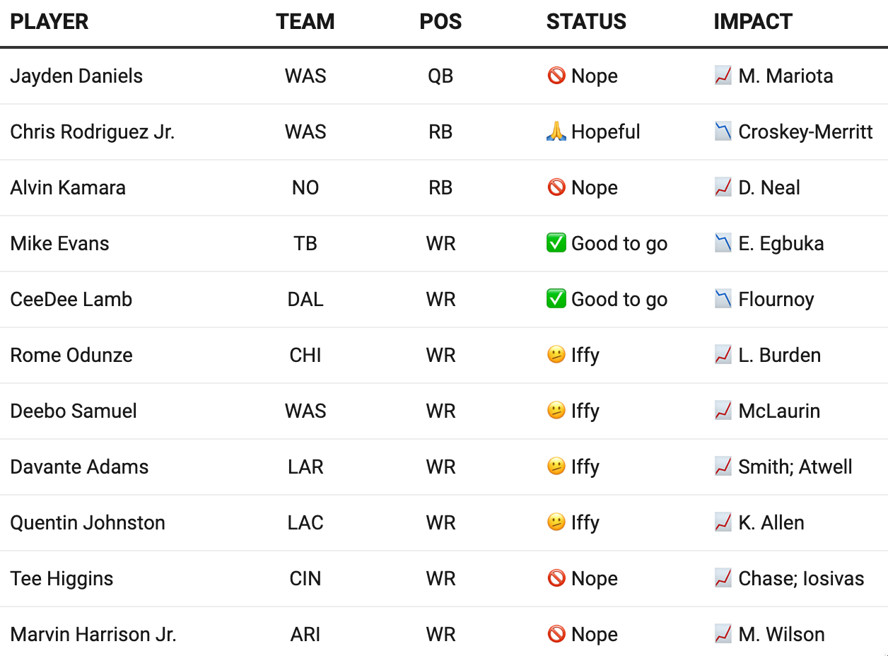 The above are my own estimates, sometimes based on unofficial media reports. Always double-check before benching a player and consult the latest NFL injury report.