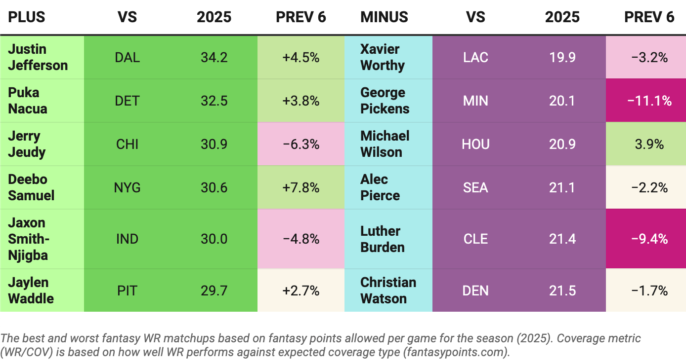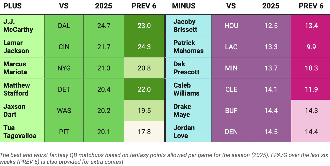Everybody and their auntie loves Brock Purdy this week (which means he’ll probably bust), but there are good reasons why. The Niners have a 28.5-point implied team total from Vegas, second-highest in Week 15, and while Purdy’s matchup didn’t make the chart above, the Titans have allowed the third-most FPPG to QBs since Week 7 (23.6), with six of those seven QBs scoring at least 21.7 fantasy points. … No Jayden Daniels this week, which is probably for the best, as it’s tough to sit a player like that in the playoffs even when all signs point to bad news, as they did last week. Anyway, interesting stat on Marcus Mariota: against man-coverage, as he has against the Giants, his deep-throw rate jumps to 16.4% (5th highest).