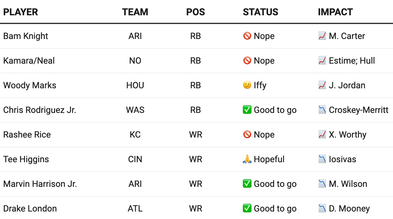 The above are my own estimates, sometimes based on unofficial media reports. Always double-check before benching a player and consult the latest NFL injury report.