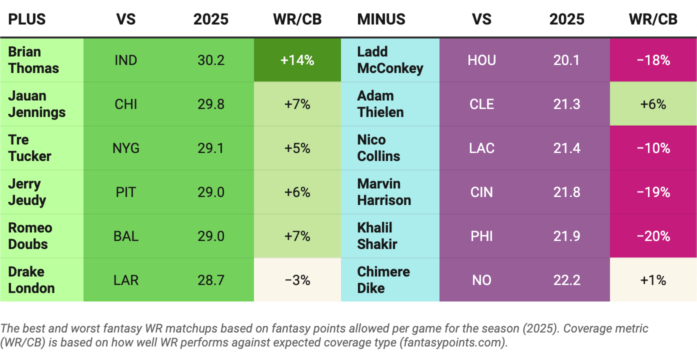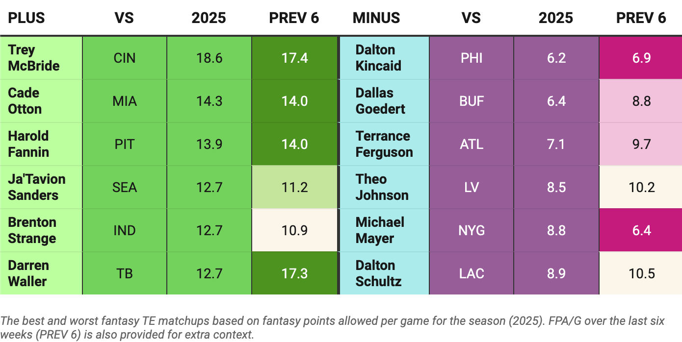 Harold Fanin has a 31 percent target share since Week 12, which just happened to be when Shedeur Sanders took over behind center. Fanin has has hit double-digit fantasy points in each of his last four games and gets one of the best fantasy matchups for TEs this week in the Steelers — if he suits up, that is (Questionable). … The Bucs have yielded the second most FPPG to TEs since Week 11, and the most TDs since Week 12. With Darren Waller a consistent red-zone threat, and the recipient of the most targets from Quinn Ewers last week outside of Jaylen Waddle, this could be a big one for those brave enough to start him in a title game.