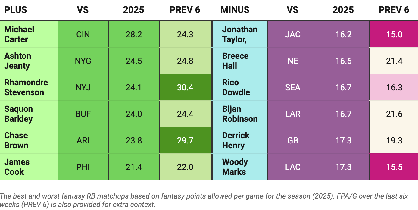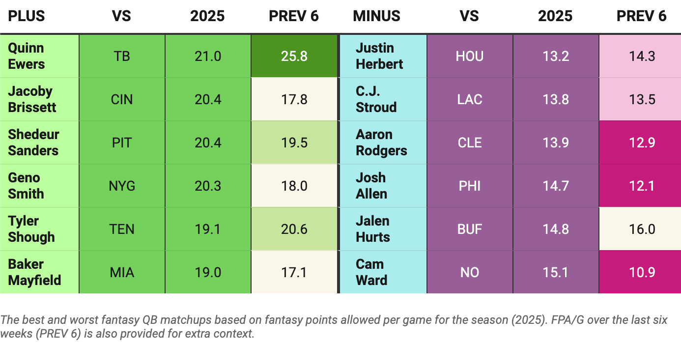 Jacoby Brissett had nine-straight QB1 fantasy finishes before last week’s untimely bust, but if you survived it, he’s in line for a bounce-bacl against Cincy, who have yielded the second-most touchdown passes in 2025 … With multiple passing touchdowns in five straight games, a career-high, and finishing as the top-scoring fantasy QB in each of the last two weeks, it’s hard not to get excited for Trevor Lawrence against the Colts, who have allowed the second-most passing yards on the year.
