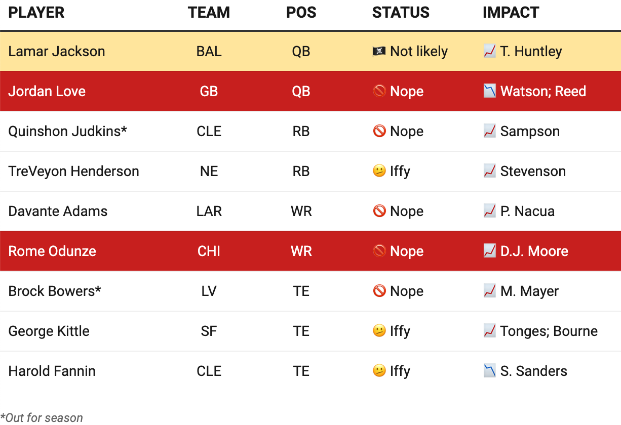 The above are my own estimates, sometimes based on unofficial media reports. Always double-check before benching a player and consult the latest NFL injury report.
