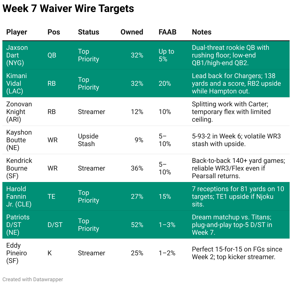 Tennessee’s offense has been a fantasy gold mine for opposing defenses, and the Patriots get them in Week 7. The Titans just gave up three turnovers and six sacks while mustering 160 yards of offense. Expect New England’s front to feast on Cam Ward and generate multiple takeaways. The Pats are an easy plug-and-play top-5 D/ST this week. Suggested FAAB: 1–3%