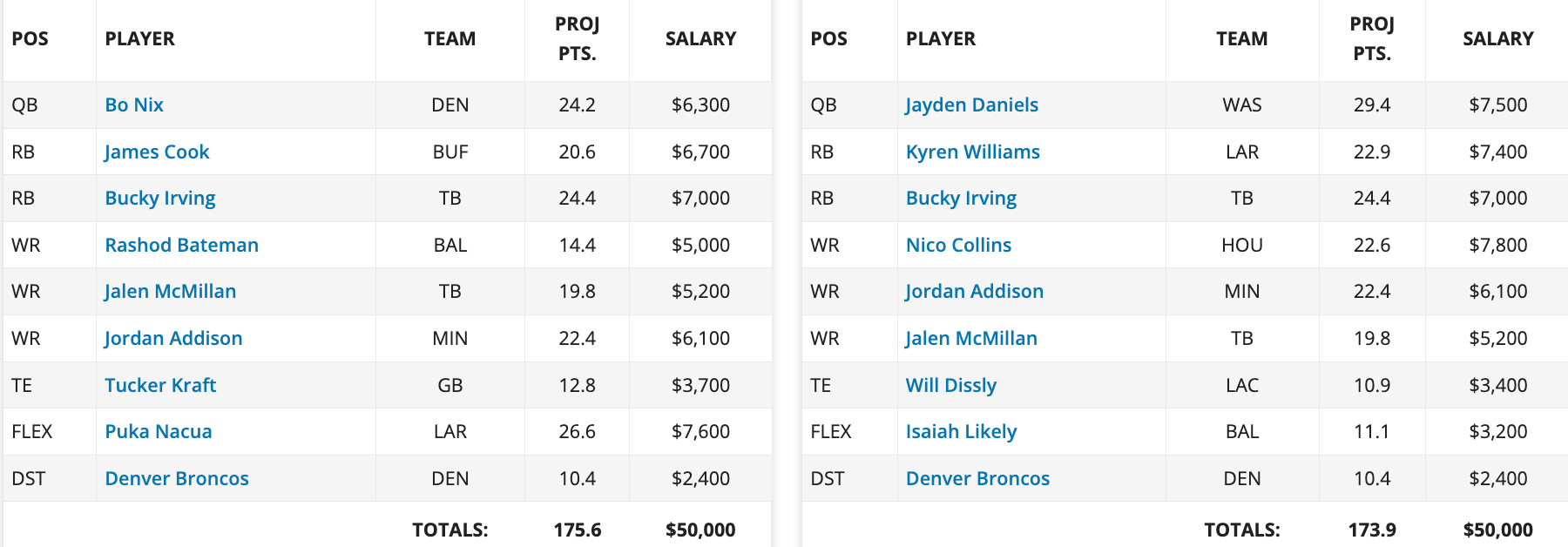QB - Jayden Daniels, WAS ($7,500) — “Commanders-Bucs looks to be the best (DFS) game of the opening round. The 50.5-point total is the highest of all six games, and the three-point spread means both teams should be looking to attack throughout. … On top of that, Tampa ranks 28th in points allowed to QBs on the season, by far the worst on any of this weekend’s slates.” — Billy Ward, Fantasy Labs